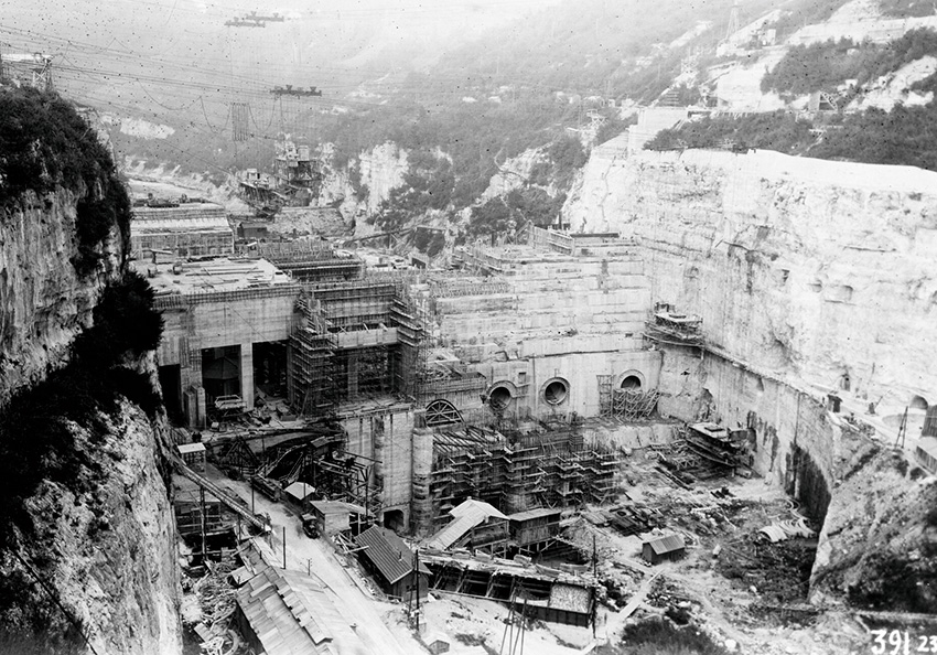 Début de la construction du barrage-centrale de Génissiat.