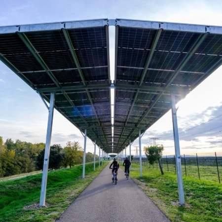 À Caderousse, un démonstrateur inédit transforme 4 km de ViaRhôna en infrastructure énergétique. Au total, ce sont 6 ombrières photovoltaïques de 110 m, installées à 5 m de hauteur, conçues pour produire de l’électricité renouvelable sans mobiliser de foncier supplémentaire.
