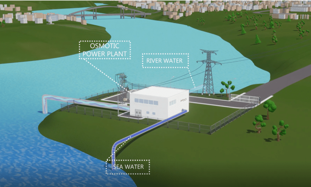 L’énergie osmotique est générée par la différence de salinité de l’eau douce des rivières et de l’eau salée de la mer lorsqu’elles se rencontrent. Elle a pour avantage de produire une électricité 100 % naturelle et renouvelable de façon permanente. Chaque année, près de 30 000 TWh d’énergie osmotique sont libérés par les deltas et estuaires dans le monde, soit une capacité supérieure à la demande mondiale d’électricité.