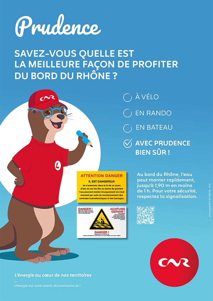 La campagne met en scène la mascotte Louloute la loutre qui relaie le slogan de prudence : Savez-vous quelle est la meilleure façon de profiter du bord du Rhône ? Avec prudence bien sûr !