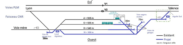- La création d’une nouvelle voie ferrée (V10) de 1500 m pouvant accueillir des trains « longs » de 1050 ml sur le faisceau actuel avec un raccordement Sud sur la ligne PLM du RFN
