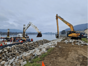 - Mise en œuvre des enrochements en carapace sur les parements immergés puis émergés des digues