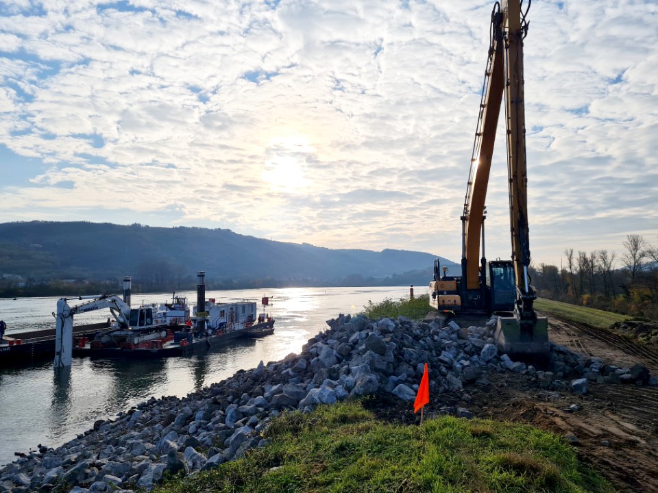 - Mise en œuvre des enrochements en carapace sur les parements immergés puis émergés des digues