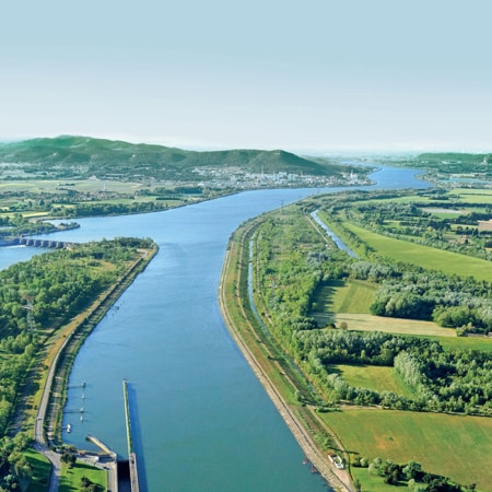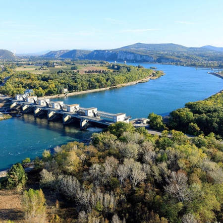 Les petites centrales hydroélectriques utilisent la force motrice et le débit du Rhône pour produire une énergie renouvelable et décarbonée. Construites au droit des barrages existants, elles relient le canal navigable et le Vieux-Rhône : une partie du débit destiné au bras naturel est ainsi turbinée puis restituée au fleuve.